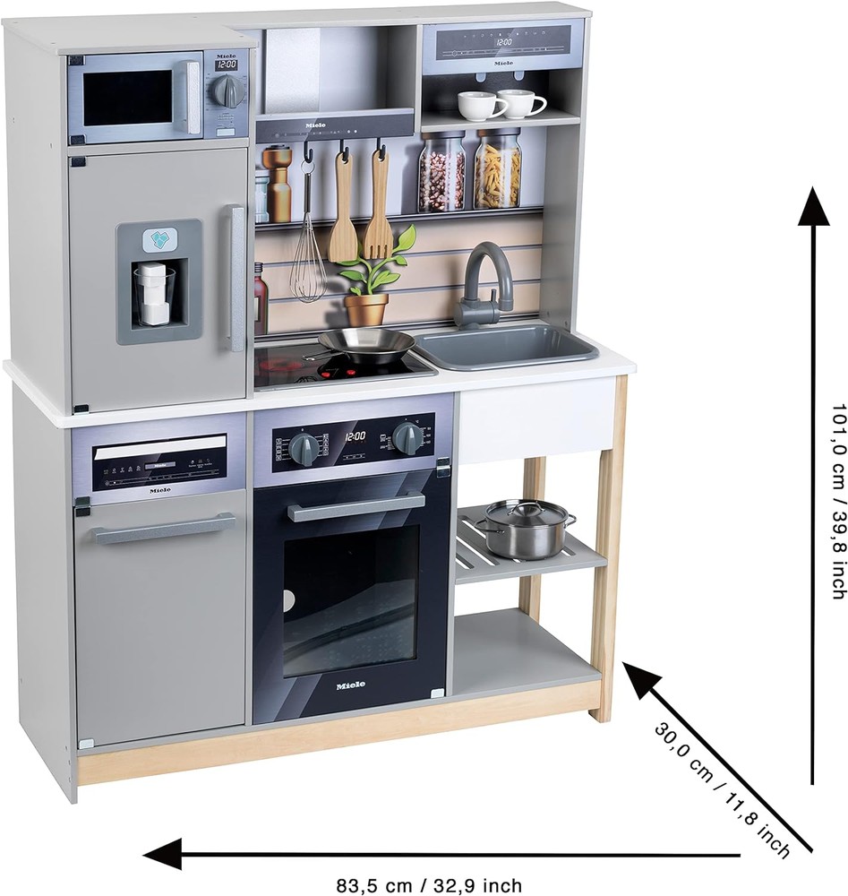 La cucina giocattolo include un fornello, un forno a microonde, una macchinetta del caffè, un frigorifero moderno con distributore di cubetti di ghiaccio, un lavello rimovibile e pentole in metallo e legno