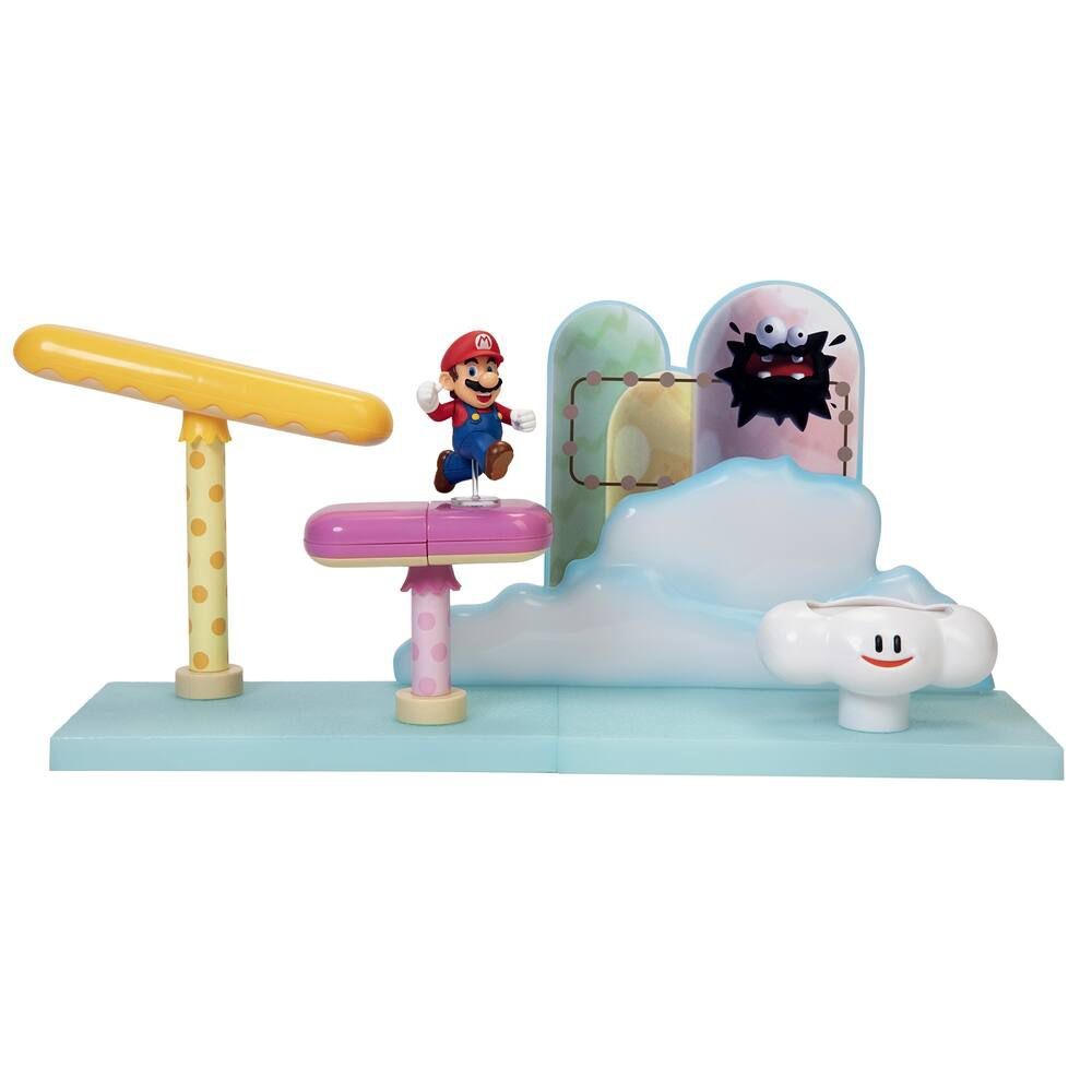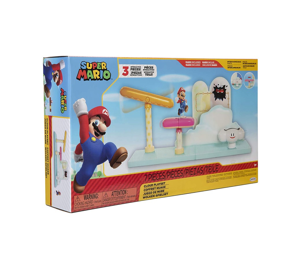 divertiti con questo cofanetto di Mario a tema aria e nuvole. Fai saltare la figura tra le piattaforme e non farla cadere! 7 pezzi in totale: 1 statuetta di Mario in plastica da 6 cm, 1 decorazione 2D, 1 piattaforma altalena, 1 piattaforma retrattile, 1 piccola nuvola e 2 basi. Dimensioni complessive: 23 x 5 x 18 cm. Licenza: Nintendo Super Mario.